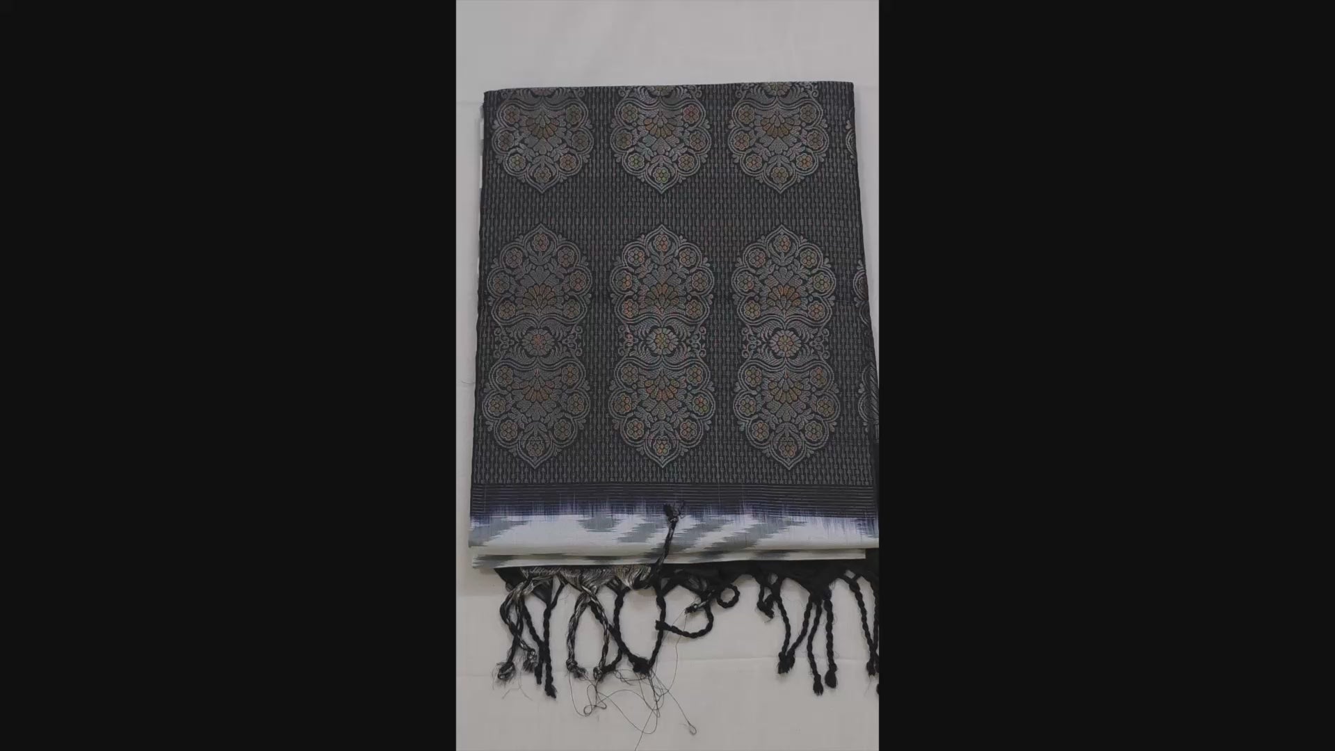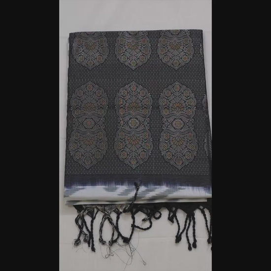 This Pochampally Ikat saree presents a refined white base accentuated by a bold black border, woven from supple silk that offers both comfort and sophistication. Celebrated for its unique geometric designs, it exemplifies skilled handloom craftsmanship, ideal for formal and cultural gatherings. The lightweight silk fabric allows effortless draping and a smooth, elegant silhouette, blending traditional aesthetics with enduring appeal. Suitable for classic or modern draping styles depending on the event.