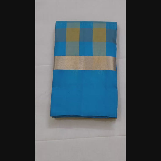 This fabric showcases a sophisticated blend of sky blue and mustard checks in a single gatti jari weave, offering a subtle yet refined texture. Enhanced by rich palls, it exudes elegance suitable for both traditional and contemporary attire. The combination of these colors and weaving technique ensures a distinctive look with visual depth and a luxurious finish. Ideal for crafting statement pieces that stand out with understated charm and expert craftsmanship.