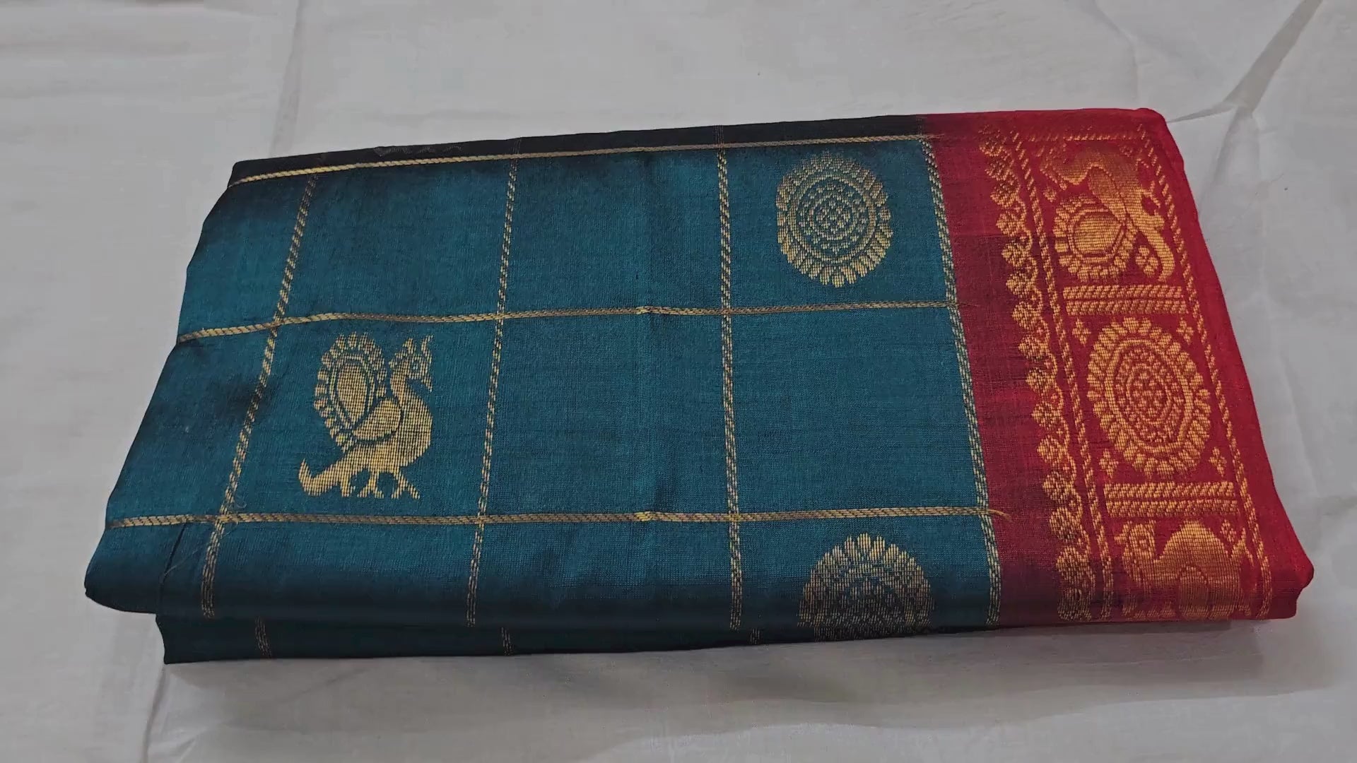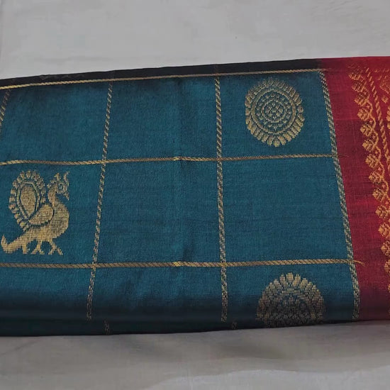 Elevate your ethnic wardrobe with this exquisite blue silk cotton saree, adorned with vibrant red border and pallu detailing. The body features intricate annam and chakram motifs complemented by delicate jari kattam work throughout, creating a mesmerizing visual appeal. Crafted with double warp construction, this saree delivers the luxurious drape and texture reminiscent of authentic Kanchipuram silk, without the premium price tag. Versatile enough for small gatherings yet striking enough for grand celebrations, this piece seamlessly transitions across occasions. The superior weaving technique ensures durability and longevity, making it a treasured addition to your collection.
