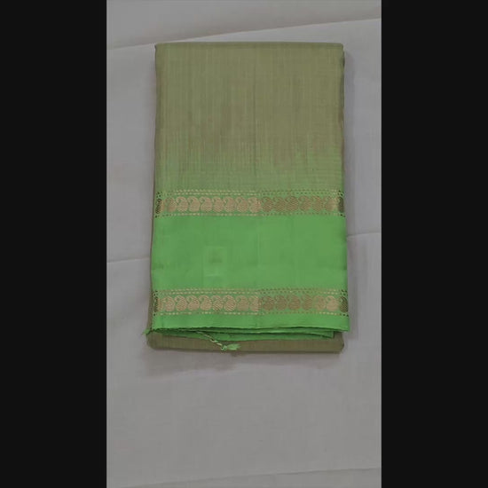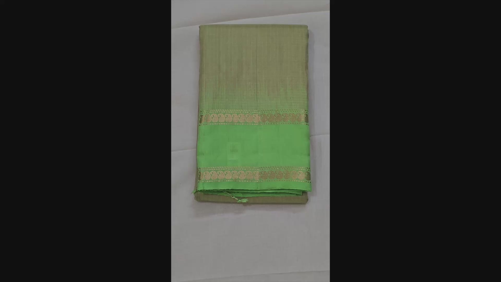 This parrot green saree, crafted from pure soft silk, features refined muthu kattam self checks that add depth to its texture. The elegant design is accentuated by retta petta and German silver jari work, offering a subtle yet sophisticated sheen. With its simple jari detailing, this saree is a perfect choice for those who value understated luxury and expert craftsmanship.